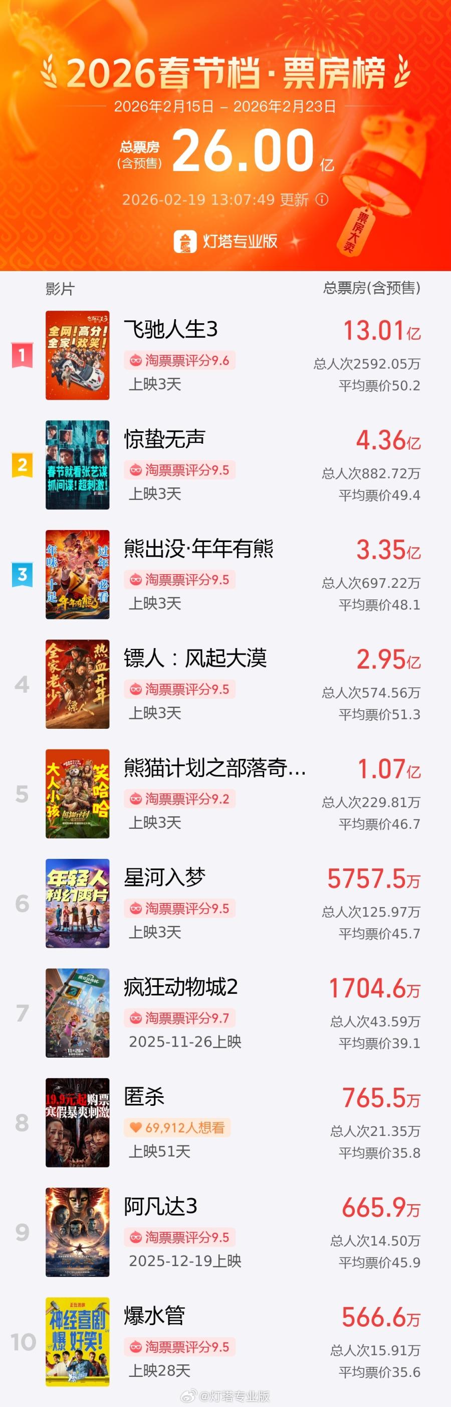 據(jù)燈塔專科版,國法2月19日13時07分,時時彩app官方下載2026春節(jié)檔(2月15日-2月23日)檔期總票房(含預(yù)售)零亂26億。